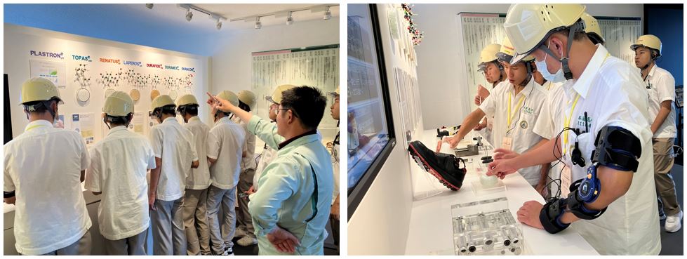 本公司带领学生们参观了富士工厂内的F-BASE(办公楼)、控制室、TSC展示室和成型室、实验室共四处场所,并由本公司员工向学生们讲解了制造工序和各种树脂的用途等。
